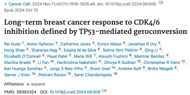 1、Kudo R, Safonov A, Jones C, et al. Long-term breast cancer response to CDK4/6 inhibition defined by TP53-mediated geroconversion. Cancer Cell. 2024 Nov 11;42(11):1919-1935.e9. Cancer Cell. 2024 Nov 11;42(11):1983. DOI: 10.1016/j.ccell.2024.10.013.