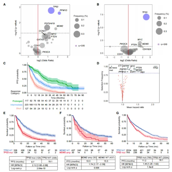 本研究首先針對(duì)467名接受一線(xiàn)CDK4/6抑制劑治療的轉(zhuǎn)移性HR+乳腺癌患者進(jìn)行了深入分析,結(jié)果揭示出TP53基因的缺失(占比達(dá)到27.6%)以及MDM2基因的擴(kuò)增(占比6.4%)與患者缺乏長(zhǎng)期疾病控制之間存在顯著關(guān)聯(lián)。這一重要發(fā)現(xiàn)提示我們,TP53和MDM2的基因狀態(tài)或許能夠作為預(yù)測(cè)CDK4/6抑制劑治療效果的關(guān)鍵生物標(biāo)志物。